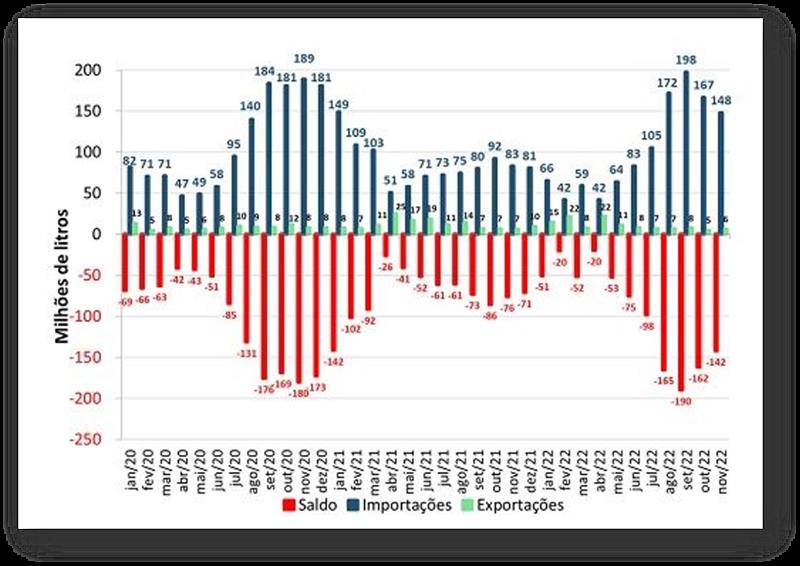 Según datos difundidos por la Secretaría de Comercio Exterior (SECEX), la balanza comercial de productos lácteos fue de aproximadamente -142,1 millones de litros de equivalente de leche en noviembre, un aumento de 20,1 millones, o aproximadamente 12,4% en comparación con el mes anterior.
