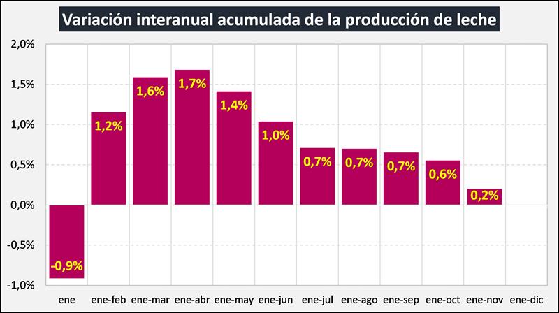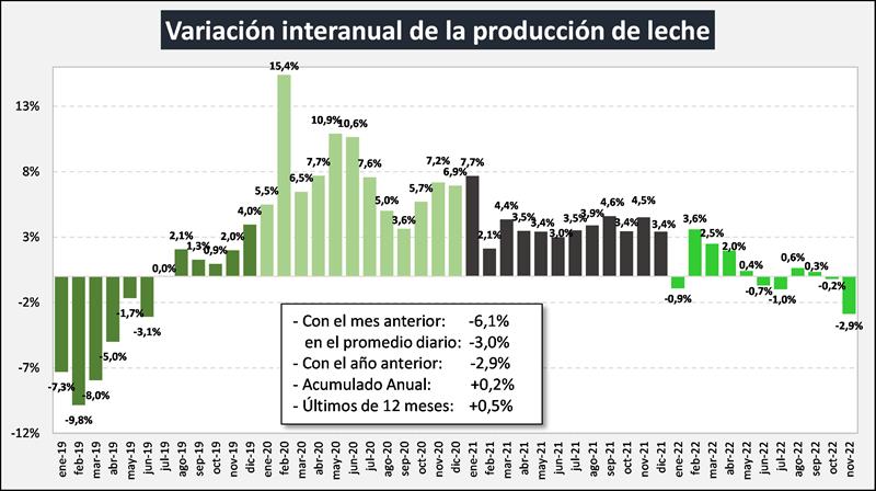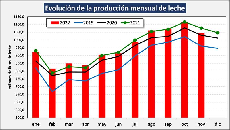 En el mes de noviembre del 2022 la producción fue de 1.046 millones de litros de leche, esto implica un valor 6,1% por debajo del mes anterior (-3,0% en el promedio diario) y un 2,9% menos que igual mes del año anterior.