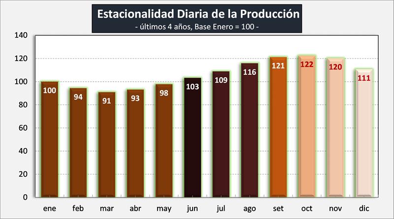 Como es habitual, la producción desde el pico de máxima en octubre, cae a una tasa del 5% mensual hasta marzo/abril (tomando el promedio diario de producción, para que no afecten la cantidad de días de cada mes), donde luego comienza un nuevo repunte hacia octubre.
