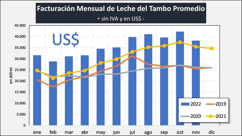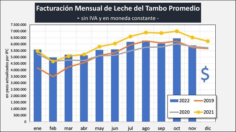 El aumento interanual de la producción del período enero-noviembre del tambo promedio en 2022 fue del 0,1% que contrapuesto con una baja en moneda constante del precio del 4,9%, representó una disminución del 4,8% en la facturación total del período.