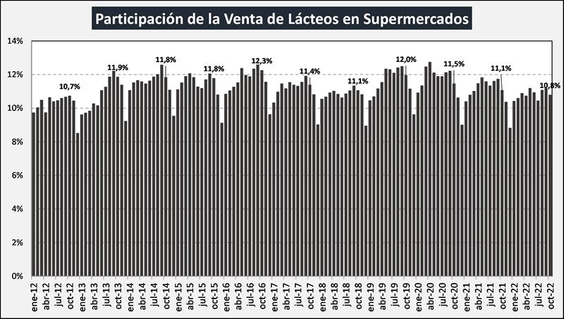 La participación de los lácteos en las ventas totales de los supermercados fue del 10,8% (11,1% en octubre de 2021 y 11,5% en octubre de 2020).