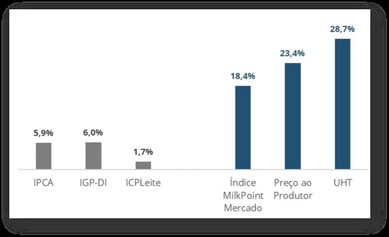 Fuente: IPCA (IBGE), IGP-DI (FGV), ICPLeite (Embrapa), Precio al Productor (CEPEA - Promedio Brasil), UHT (FIPE) - elaborado por MilkPoint Mercado.