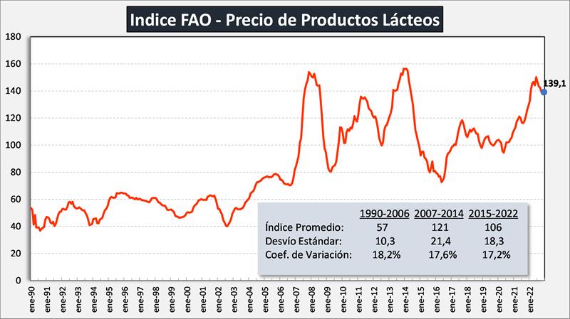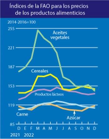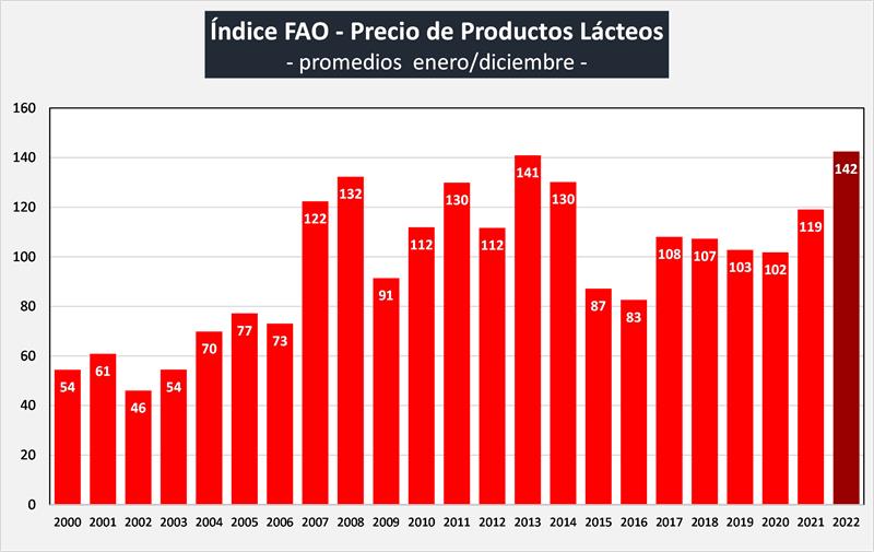 Indice de Precios de los Lácteos de FAO 6/1/2023![]() ![]() El índice de precios de los productos lácteos de la FAO registró en diciembre un promedio de 139,1 puntos, esto es, 1,5 puntos (un 1,1 %) más que en noviembre, registrando así un aumento tras cinco meses consecutivos de descensos y superando en 10,1 puntos (un 7,9 %) su valor de hace un año. En diciembre subieron los precios internacionales del queso, debido principalmente a una robusta demanda mundial de importaciones y una cierta escasez de disponibilidades exportables en un contexto de gran volumen de ventas internas a los sectores minorista y de los servicios, especialmente en Europa occidental. Por el contrario, los precios internacionales de la manteca cayeron por sexto mes consecutivo, a consecuencia de la persistente atonía de la demanda mundial de importaciones y la disponibilidad de existencias internas suficientes para cubrir las necesidades a corto plazo. Por su parte, los precios internacionales de la leche en polvo descendieron ligeramente, ya que la bajada de los precios en Europa occidental, que obedeció principalmente a la atonía de la demanda de suministros al contado, compensó el aumento de las cotizaciones de los suministros procedentes de Oceanía, sobre todo a consecuencia de la actividad de las compras en Asia sudoriental y las fluctuaciones cambiarias. En 2022 en conjunto, el índice de precios de los productos lácteos de la FAO registró un promedio de 142,5 puntos, lo que supone un aumento de 23,3 puntos (un 19,6 %) respecto de 2021 y representa el promedio anual más elevado registrado desde 1990. En el gráfico de abajo podemos ver la evolución mensual del índice en el año 2022 comparado con los tres años anteriores, donde hay una diferencia promedio del 30%. ![]() Por su parte el gráfico siguiente muestra el promedio de cada año del índice de precios de los lácteos de FAO de los últimos 23 años (2000-2022): El año 2022, tiene el índice más alto de los últimos 23 años. ![]() Índice de Precios de los Productos Alimenticios – FAO ![]() elaborado por el OCLA con información de FAO