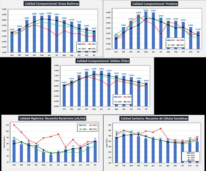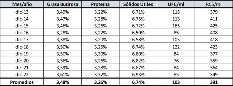 Aclaración: como se indica en el título, los promedios son ponderados en base a la producción de leche de cada mes, el mes de diciembre 2022 esta estimada la producción ya que a la fecha de elaborar el presenta informe, aún no se encontraba publicada.