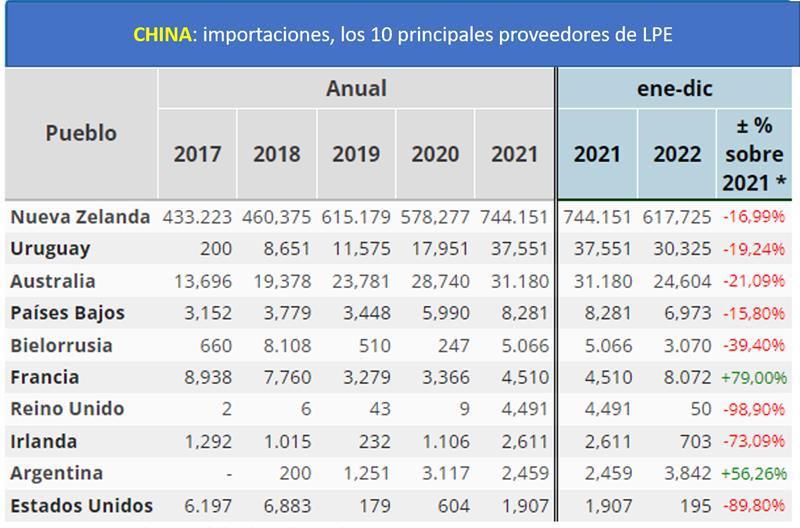 CHINA: importaciones de productos lácteos a diciembre de 2022 23/1/2023