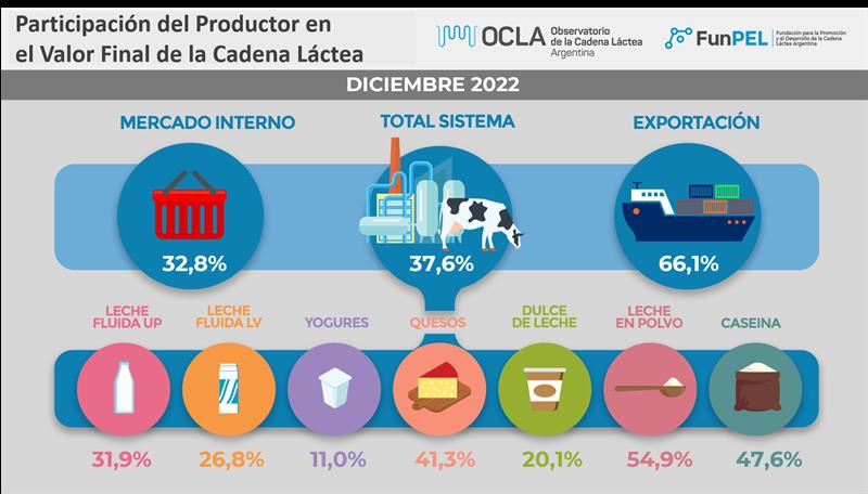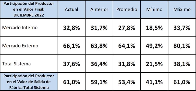 La participación del productor en el total del sistema fue para diciembre de 2022 del 37,6%, 1,2 puntos por encima del mes anterior, bastante por encima de la media del 31,8%. Un aumento de 1,1 punto en los valores finales de mercado interno y una mejora de 2,3 puntos porcentuales en la participación de los valores de mercado externo, colocándola 2 puntos por encima de la media histórica de la serie disponible (64,1%). La participación del productor sobre el valor de salida de fábrica (precio al que vende la industria) fue de 61,0%, 0,9 punto encima del mes pasado y 7,6 puntos encima del promedio de la serie (53,4%), llegando también la participación del productor en el valor de salida de fábrica al máximo de la serie. Cabe recordar que la serie histórica para los valores de salida de fábrica tiene una mayor extensión temporal que el resto.