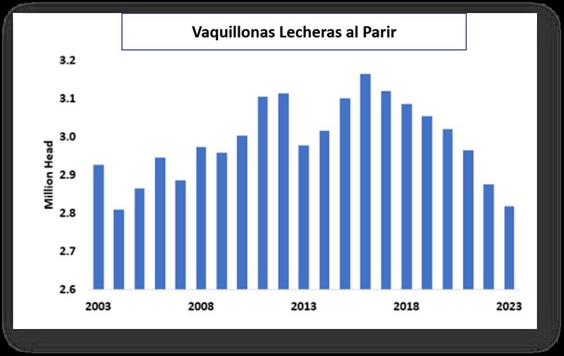 El informe de producción de leche de la semana pasada mostró un crecimiento más lento de lo esperado en la producción de leche de EE. UU., y esta semana el USDA golpeó al complejo lácteo con dos datos más que sugieren un crecimiento lento en el futuro. Se esperaba que solo 2,77 millones de novillas lecheras parieran e ingresaran al rebaño de ordeño este año, según el informe anual de Ganado de la agencia. Eso es un 2% menos que el año pasado y el inventario de vaquillas lecheras más pequeño desde 2004. Si los productores lecheros desarrollan un apetito por la expansión, la escasez de vaquillas elevará el valor de las vacas lecheras, aumentando el costo de poner más vacas en el establo y más leche en el tanque.