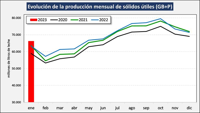 Abajo se puede ver la evolución de los denominados “sólidos útiles” (grasa butirosa y proteína), que subieron el 4,7% en enero de 2023, mucho más que el crecimiento de la producción medida en litros de leche (+3,5%), evidenciando una mejora importante del contenido de los sólidos en la leche.