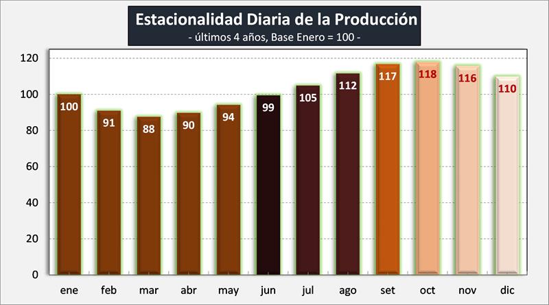 Como es habitual, la producción desde el pico de máxima en octubre, cae a una tasa del 5% mensual hasta marzo/abril (tomando el promedio diario de producción, para que no afecten la cantidad de días de cada mes), donde luego comienza un nuevo repunte hacia octubre.