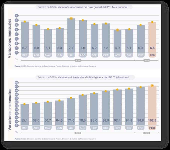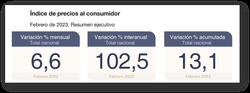 El nivel general del Índice de precios al consumidor (IPC) representativo del total de hogares del país registró en febrero una variación de 6,6% con relación al mes anterior, acumuló un 13,1% en el primer bimestre del año y la variación interanual fue del 102,5%.