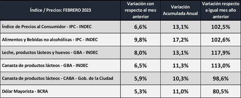 Precios de los lácteos al mes de febrero de 2023 14/3/2023