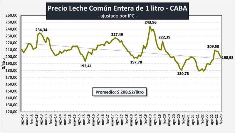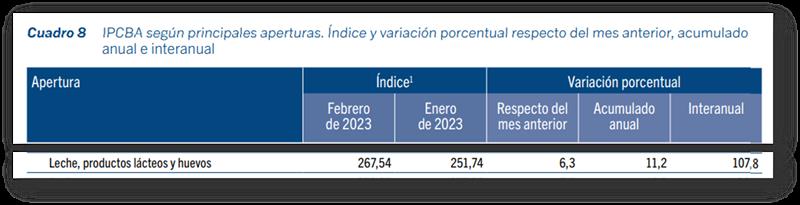Según datos publicados por la Dirección General de Estadísticas y Censos - Ministerio de Hacienda del Gobierno de la Ciudad de Buenos Aires, los precios de los productos lácteos de esta canasta, tuvieron un crecimiento mensual promedio ponderado del 5,9%, acumulan en los dos primeros meses del año el 10,3% y el interanual llega al 98,6%. El ponderado es elaborado por OCLA sobre el mismo criterio mencionado para la canasta GBA de INDEC.