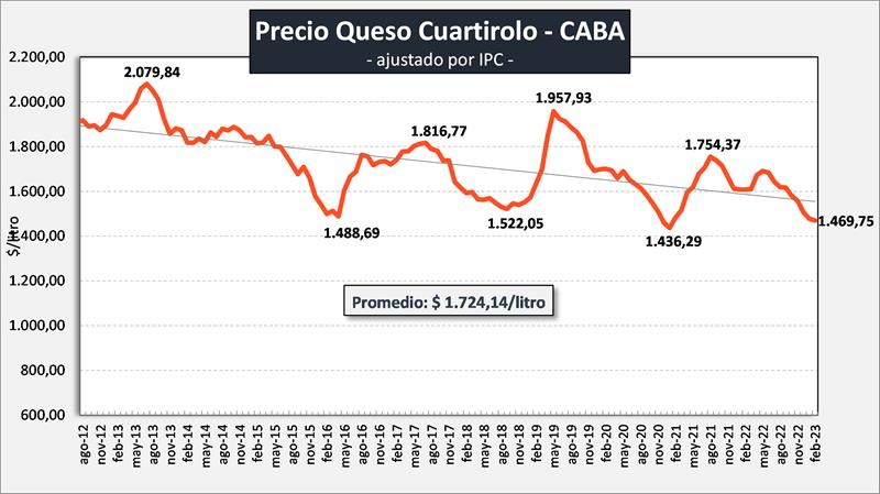 En el caso del queso cuartirolo mantiene también una tendencia decreciente en la serie de 10 años. El precio de febrero está 14,8% por debajo de la media y 29,3% por debajo del máximo alcanzado en 2013.