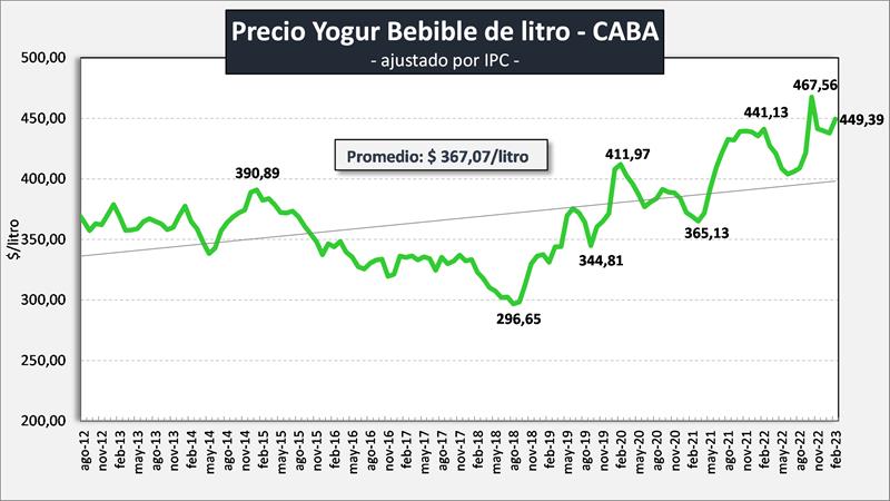 La situación de los yogures bebibles de litro es diferente, sostienen el nivel de consumo de la categoría, y sus precios se ajustaban más en sintonía con el ritmo inflacionario, con algunos altibajos. El precio actual está 22,4% encima de la media de la serie. Lamentablemente tiran para abajo el promedio del mix, ya que su aumento de ventas no fue acompañado por las ventas de yogures en pote, postres y flanes que tienen un mayor valor por litro equivalente.