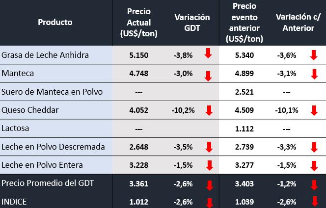 -GDT Price Index indica el promedio del cambio porcentual en los precios para cada especificación, ponderado por la cantidad de cada especificación vendida. GDT proporciona un cambio en el índice de precios de GDT del evento anterior para todos los productos, además de un equivalente para cada grupo de productos y cada combinación de grupo de productos/período de contrato. El índice de precios proporciona un reflejo más preciso de los movimientos de precios entre los eventos comerciales.