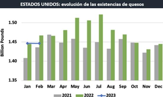 La leche sigue siendo abundante y como resultado, los fabricantes de Clase III y IV están trabajando arduamente para procesar cargas adicionales. Sin embargo, al menos hasta fines de febrero, esta producción adicional no se tradujo en inventarios excesivos, especialmente en el caso del queso. Según el informe de almacenamiento en frío del USDA, publicado el jueves por la tarde, las existencias de queso a fines de febrero totalizaron 1,446 millones de libras (655.000 toneladas), prácticamente sin cambios con respecto al mes anterior. Esto sugiere que a pesar de que las tinas de queso estuvieron activas durante el mes, la demanda mejoró lo suficiente como para evitar la acumulación de existencias.