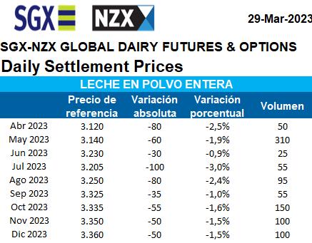 Mercado de Futuros para la Leche en Polvo Entera 30/3/2023