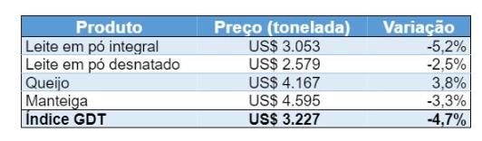 Los demás productos continuaron mostrando devaluaciones. La leche entera en polvo se negoció a un promedio de US$ 3.053/ton, una baja de 5,0% , la mayor caída del último evento, seguida de la caída de 3,3% de la manteca, que se negoció a un promedio de US$ 4.595/ton , y por la caída de 2,5% en la leche descremada en polvo, que cerró en promedio a US$ 2.579/t