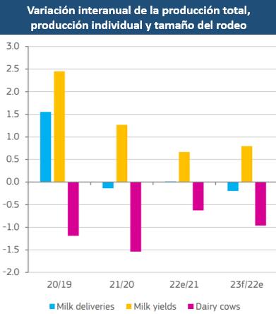 Con respecto al comercio, se espera que el aumento en la producción de queso y suero contribuya a un aumento del 2 % en las exportaciones de productos lácteos en 2023. Esto supone una recuperación de la demanda china tras la flexibilización de las restricciones por el covid y exportaciones estables al Reino Unido y EE. UU. Una inflación más baja en el este de Asia podría promover la demanda de otros productos lácteos como LPD, pero puede no ser suficiente para compensar la disminución de la demanda interna de productos lácteos frescos. Sin embargo, se espera que las exportaciones de LPE continúen disminuyendo interanualmente, aunque se desaceleren al 5% ya que la producción se prevé que caiga.