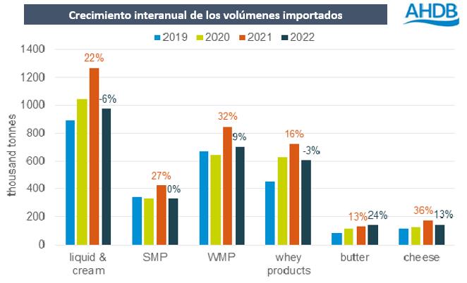 Todos los productos registraron menores importaciones en 2022, aunque para la mayoría, los volúmenes de importación fueron similares o ligeramente superiores a los niveles de 2020. La manteca fue una excepción que mostró un aumento marginal en comparación con el año anterior. Los productos que registraron la mayor disminución interanual en 2022 fueron la leche y la crema y los productos de suero.