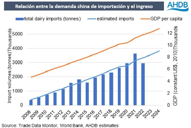 Históricamente ha habido una fuerte relación entre el crecimiento económico de China (medido por el PBI per cápita) y su nivel de importaciones de productos lácteos. Tanto es así, que la comparación de las dos tendencias puede dar una indicación de las importaciones esperadas y los riesgos potenciales en torno a la acumulación de existencias.