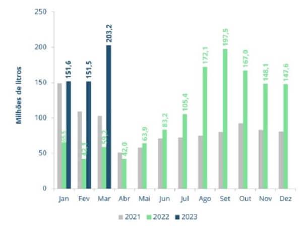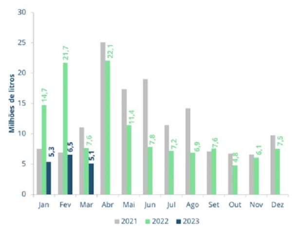 En cuanto a las importaciones, el volumen total aumentó un 34,1%, finalizando el mes con 203,2 millones de litros de equivalente de leche importados a Brasil. En la comparación con el resultado obtenido en marzo de 2022, hubo un aumento del 243% en el volumen importado en el mes.