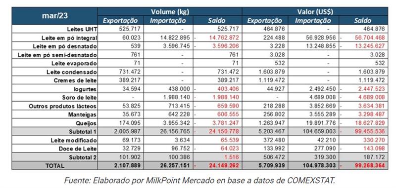 Tabla 1. Balanza comercial de lácteos en marzo de 2023.
