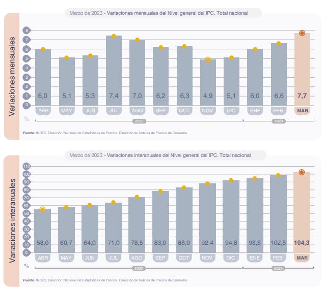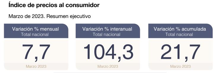 El nivel general del Índice de precios al consumidor (IPC) representativo del total de hogares del país registró en febrero una variación de 7,7% con relación al mes anterior, acumuló un 21,7% en el primer trimestre del año y la variación interanual fue del 104,3%.