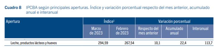 Si miramos, también en CABA el índice que incluye a los lácteos juntos con huevos (huevos aumentó el 10,8%), podemos decir que lácteos en particular es una de las divisiones que menos subió en la categoría de Alimentos y Bebidas.