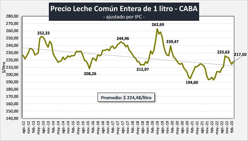 Según datos publicados por la Dirección General de Estadísticas y Censos - Ministerio de Hacienda del Gobierno de la Ciudad de Buenos Aires, los precios de los productos lácteos de esta canasta, tuvieron un crecimiento mensual promedio ponderado del 7,4%, acumulan en los tres primeros meses del año el 18,5% y el interanual llega al 104,9%. El ponderado es elaborado por OCLA sobre el mismo criterio mencionado para la canasta GBA de INDEC.