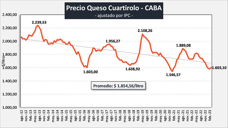 En el caso del queso cuartirolo mantiene también una tendencia decreciente en la serie de 10 años. El precio de marzo está 13,6% por debajo de la media y 28,4% por debajo del máximo alcanzado en 2013.