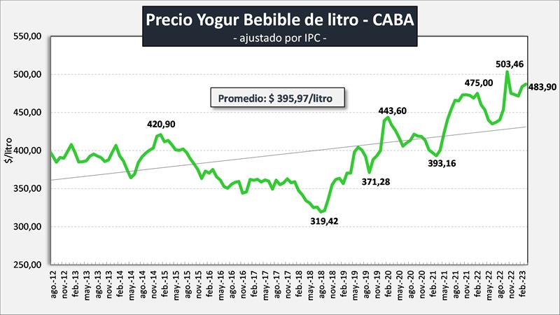 La situación de los yogures bebibles de litro es diferente, sostienen el nivel de consumo de la categoría, y sus precios se ajustaban más en sintonía con el ritmo inflacionario, con algunos altibajos. El precio actual está 22,2% encima de la media de la serie. Lamentablemente tiran para abajo el promedio del mix, ya que su aumento de ventas no fue acompañado por las ventas de yogures en pote, postres y flanes que tienen un mayor valor por litro equivalente.