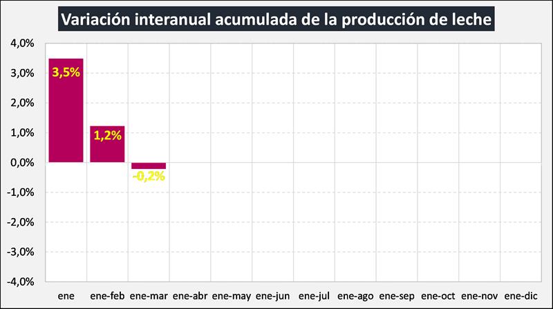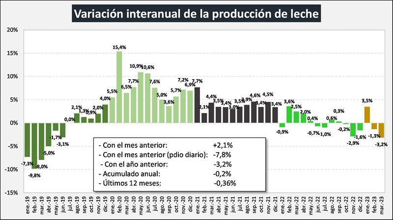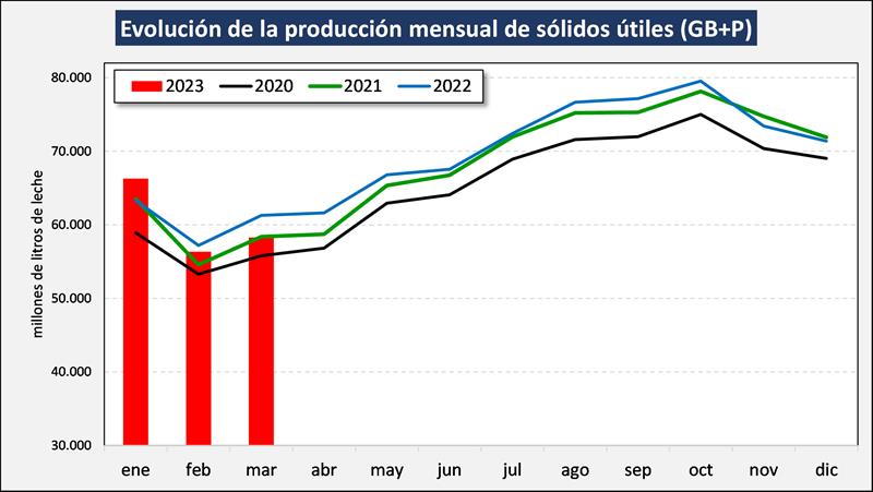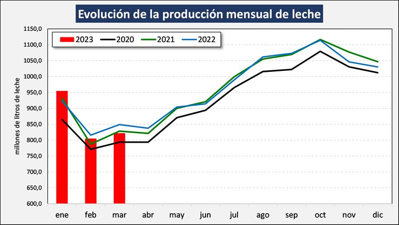 En el mes de marzo del 2023 la producción fue de 822 millones de litros de leche, esto implica un valor 2,1% por encima del mes anterior (-7,8% en él promedio diario) y un 3,2% menos que igual mes del año anterior.