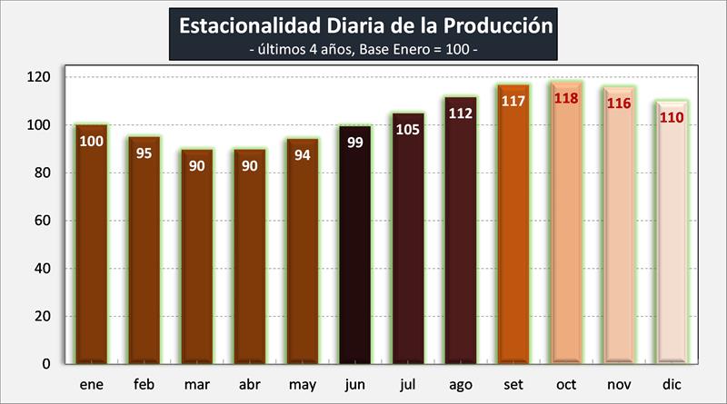 Como es habitual, la producción desde el pico de máxima en octubre, cae a una tasa del 5% mensual hasta marzo/abril (tomando el promedio diario de producción, para que no afecten la cantidad de días de cada mes), donde luego comienza un nuevo repunte hacia octubre.![]()