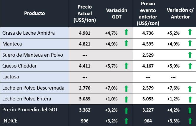 -GDT Price Index indica el promedio del cambio porcentual en los precios para cada especificación, ponderado por la cantidad de cada especificación vendida. GDT proporciona un cambio en el índice de precios de GDT del evento anterior para todos los productos, además de un equivalente para cada grupo de productos y cada combinación de grupo de productos/período de contrato. El índice de precios proporciona un reflejo más preciso de los movimientos de precios entre los eventos comerciales.