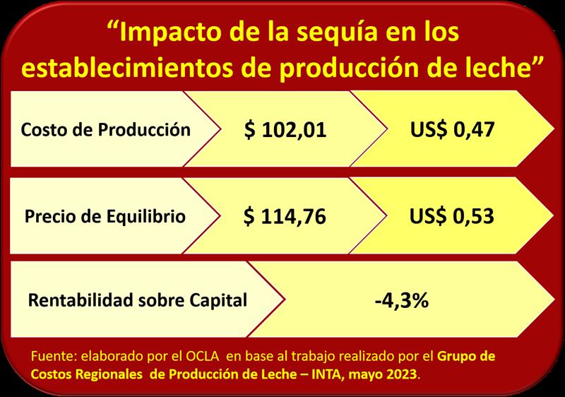 Debido a la situación de sequía generalizada que se vino dando durante finales de 2022 y el primer cuatrimestre de 2023, que afecta los niveles productivos y los costos de producción de los tambos, se acompaña el análisis en el tambo promedio en base al trabajo realizado por INTA.