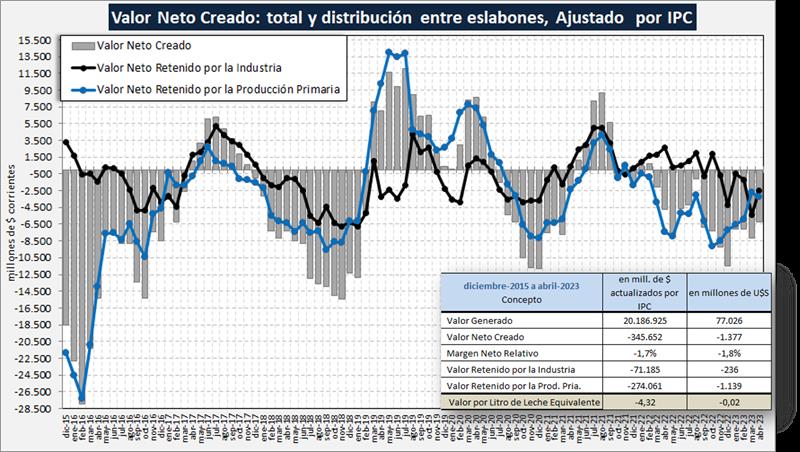 El gráfico siguiente muestra los resultados sectoriales actualizados por IPC y en el cuadro se puede ver claramente qué en estos últimos 7 años, la cadena no retuvo del valor que generó, $ 4,32 o US$ 0,02 por litro de leche equivalente, perdiendo esa mayor diferencia el sector primario respecto al industrial (80/20).