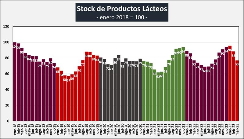 Las existencias en volumen de productos son un 21,0% inferiores en marzo 2023 que las iniciales del año. En litros de leche equivalentes, utilizando los coeficientes de conversión y extrapolando la muestra de la resolución 230 a la población total, las existencias fueron en marzo de 834 millones de litros de leche, un 18,1% inferiores a los 1.019 millones de litros de leche equivalentes de finales del año pasado.