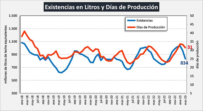 Evolución mensual de las existencias en litros de leche equivalentes y en días de producción de leche: