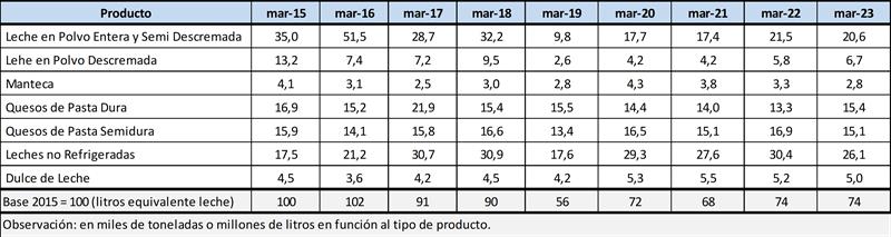 La información proviene del Panel de industrias lácteas establecido a partir del relevamiento coyuntural de la Resolución 230/16 e información histórica de la Resolución 7/14, ambas de la SAGyP. Los valores se expresan en toneladas y miles de litros, dependiendo del tipo de producto. La conversión a litros de leche equivalente se realiza con los coeficientes establecidos en la Disposición 1/2018 de la DNL-MPyT.