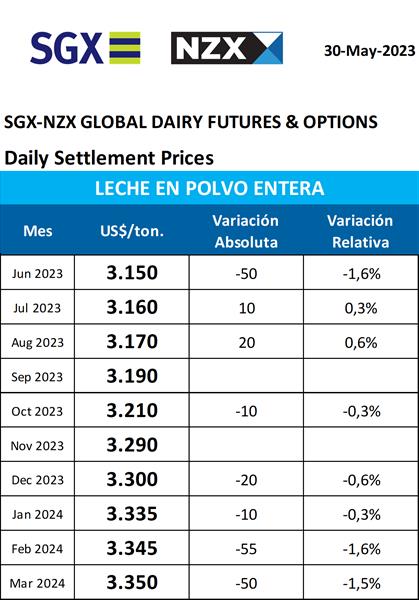 Mercado de Futuros NZX – Leche en Polvo Entera 30/5/2023