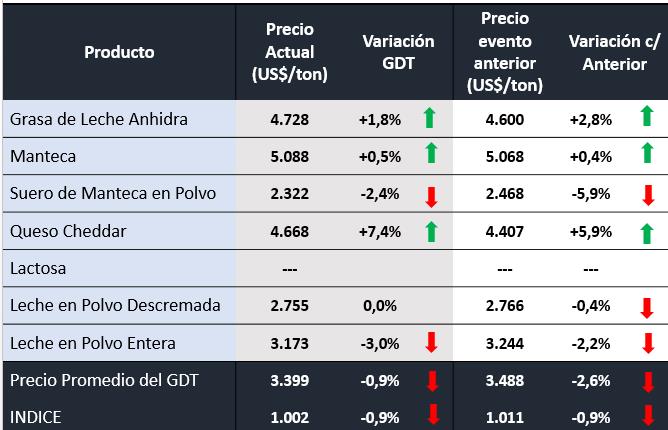 -GDT Price Index indica el promedio del cambio porcentual en los precios para cada especificación, ponderado por la cantidad de cada especificación vendida. GDT proporciona un cambio en el índice de precios de GDT del evento anterior para todos los productos, además de un equivalente para cada grupo de productos y cada combinación de grupo de productos/período de contrato. El índice de precios proporciona un reflejo más preciso de los movimientos de precios entre los eventos comerciales.