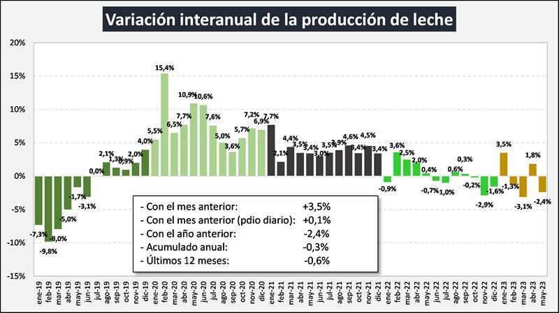 La producción en los primeros cinco meses del año fue 0,3% inferior a enero-mayo del año 2022. Seguramente que la producción para los meses que restan del invierno, se mantenga con tasas negativas respecto al año anterior, queda por ver el comportamiento en el último trimestre para determinar el volumen de producción anual, que según las consultas realizadas en estos días a diferentes actores sectoriales oscilaría entre un sostenimiento de la producción en 2023 hasta algunos casos que pronostican caídas máximas entre 3 y 5%.