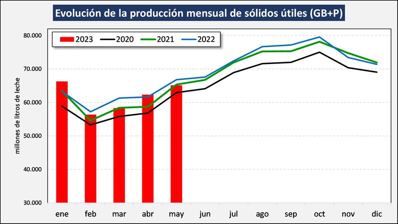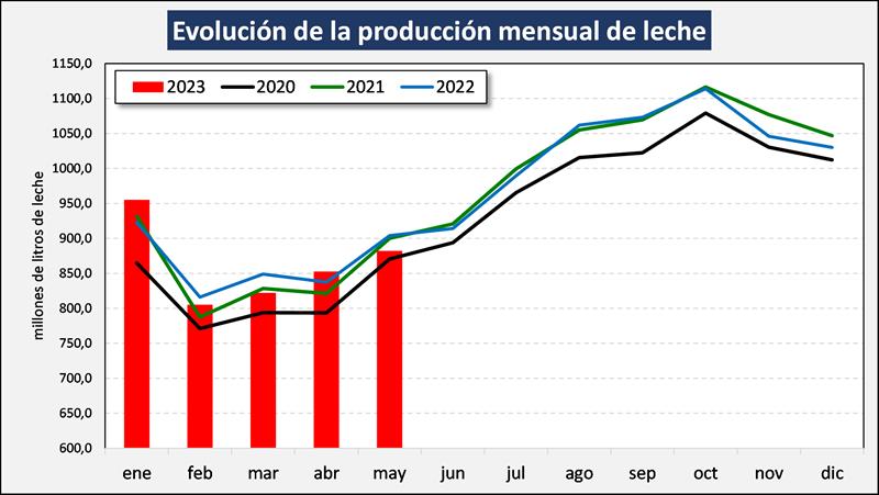 En el mes de mayo del 2023 la producción fue de 882.287.671 litros de leche, esto implica un valor 3,5% por encima del mes anterior (+0,1% en él promedio diario) y un 2,4% menos que igual mes del año anterior.