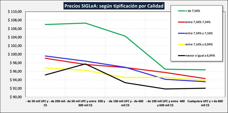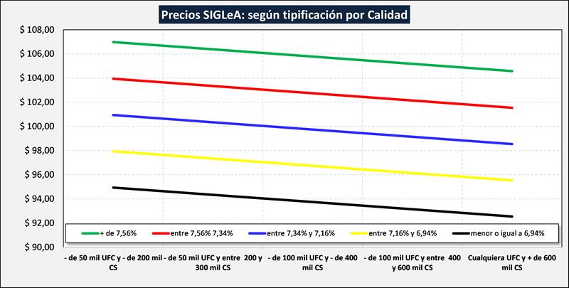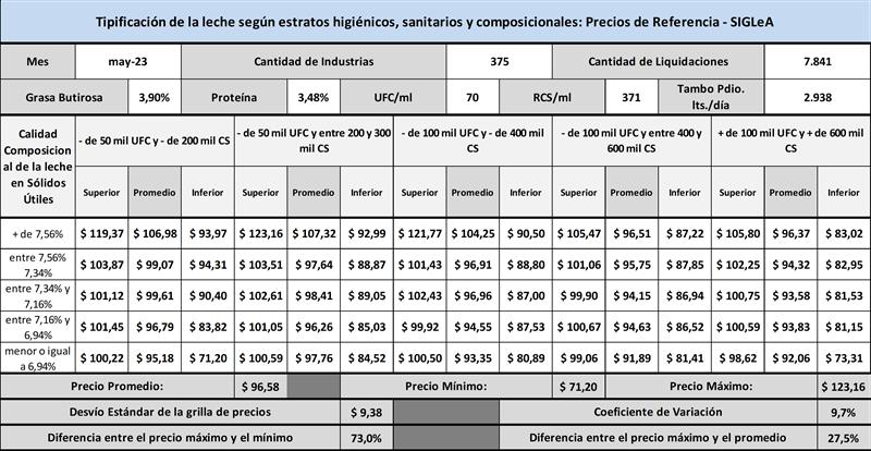 En el cuadro de tipificación, la leche comercializada se divide en 25 estratos según composición y calidad higiénico-sanitaria y, dentro de cada estrato, se muestra un promedio ponderado del precio del total de esos litros y además un promedio ponderado del 20% superior e inferior de los precios.