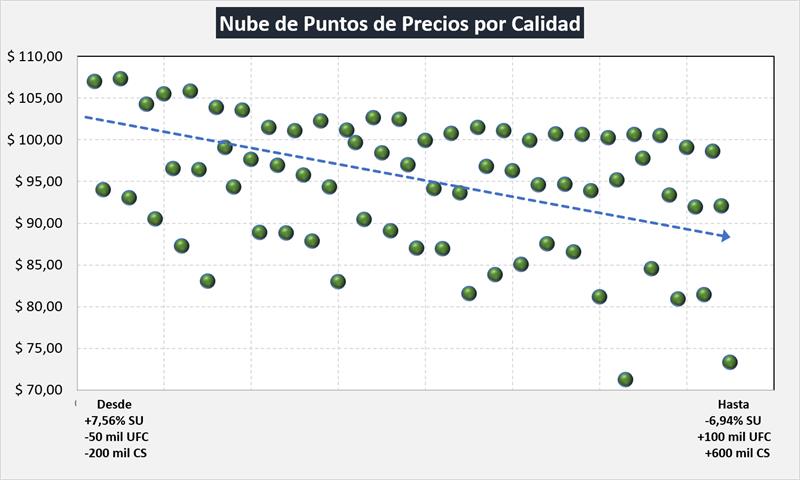 Si elaboramos una nube de puntos con los diferentes precios disponibles en función a las calidades, podemos observar que se da una pendiente descendente de precios a medida que es menor la calidad integral de la leche, pero esa pendiente podría ser mucho más pronunciada si se pretende mejorar/incentivar la mejor calidad de leche.