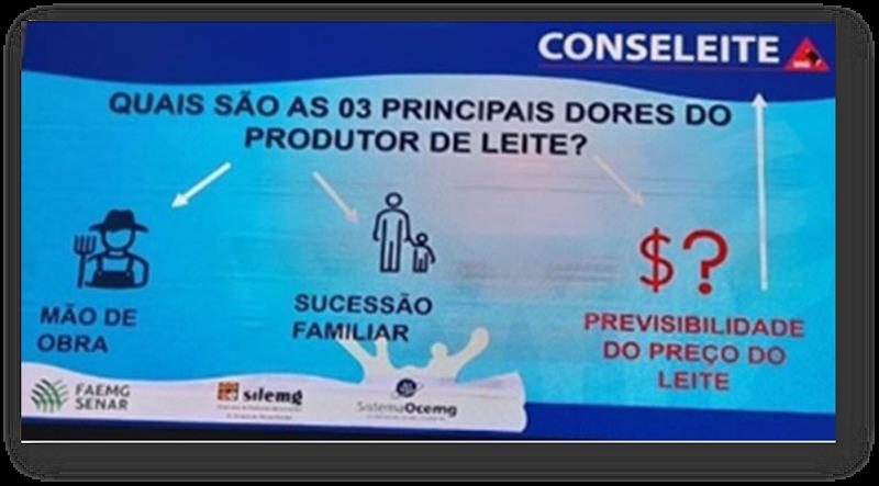 La diapositiva que aparece en la foto de abajo fue parte de la presentación del productor Jonadan Ma, presidente de la Comisión de Leche de la FAEMG, en la reunión del Conseleite MG realizada en la última edición de Mega Leite, en Belo Horizonte. La diapositiva resumió los “3 Principales Dolores del Productor de Leche” en el estado que es el mayor productor de leche del país y que concentra casi el 30% del volumen producido anualmente en nuestro mercado: