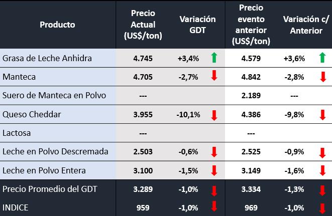 -GDT Price Index indica el promedio del cambio porcentual en los precios para cada especificación, ponderado por la cantidad de cada especificación vendida. GDT proporciona un cambio en el índice de precios de GDT del evento anterior para todos los productos, además de un equivalente para cada grupo de productos y cada combinación de grupo de productos/período de contrato. El índice de precios proporciona un reflejo más preciso de los movimientos de precios entre los eventos comerciales.