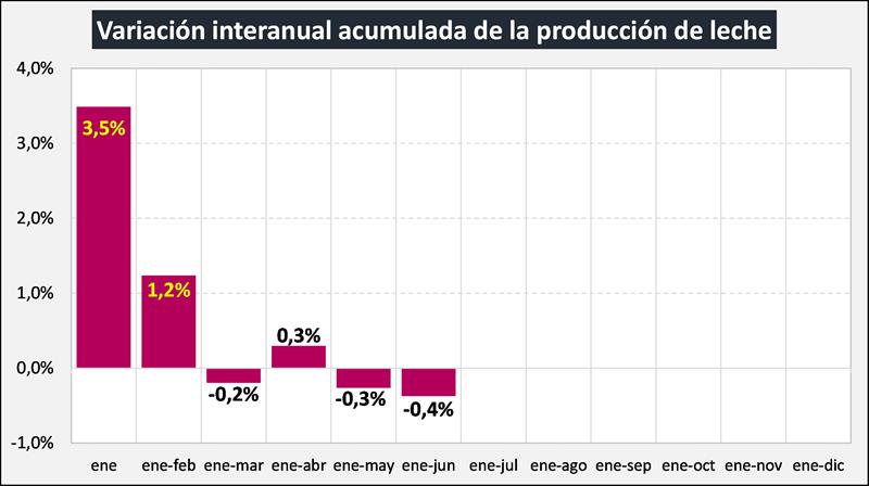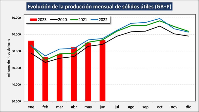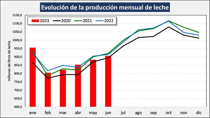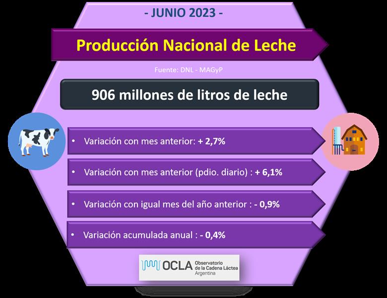 En el mes de junio del 2023 la producción fue de 906 millones de litros de leche, esto implica un valor 2,7% por encima del mes anterior (+6,1% en él promedio diario) y un 0,9% menos que igual mes del año anterior.