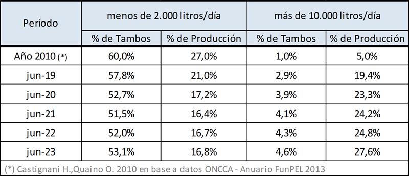Puede verse en el cuadro siguiente al comparar con datos disponibles del año 2010, que en un extremo disminuye la participación tanto en cantidad de tambos como en el volumen de producción de las unidades productivas de menos de 2.000 litros diarios y en el otro extremo de la estratificación, se incrementa la participación de las unidades de más de 10.000 litros diarios.